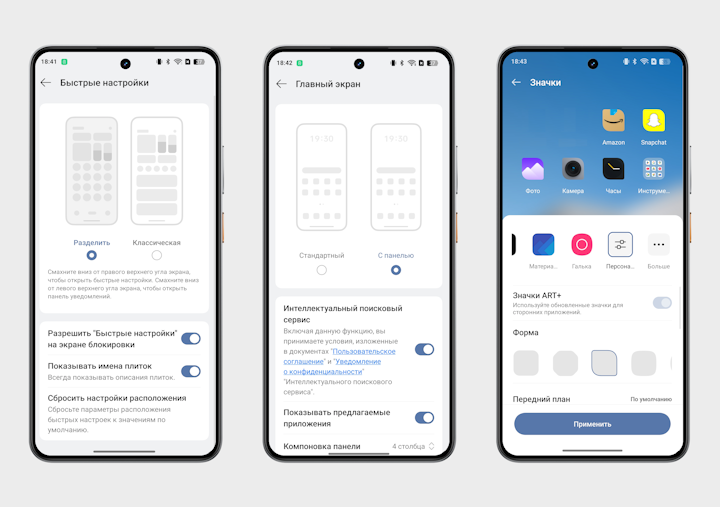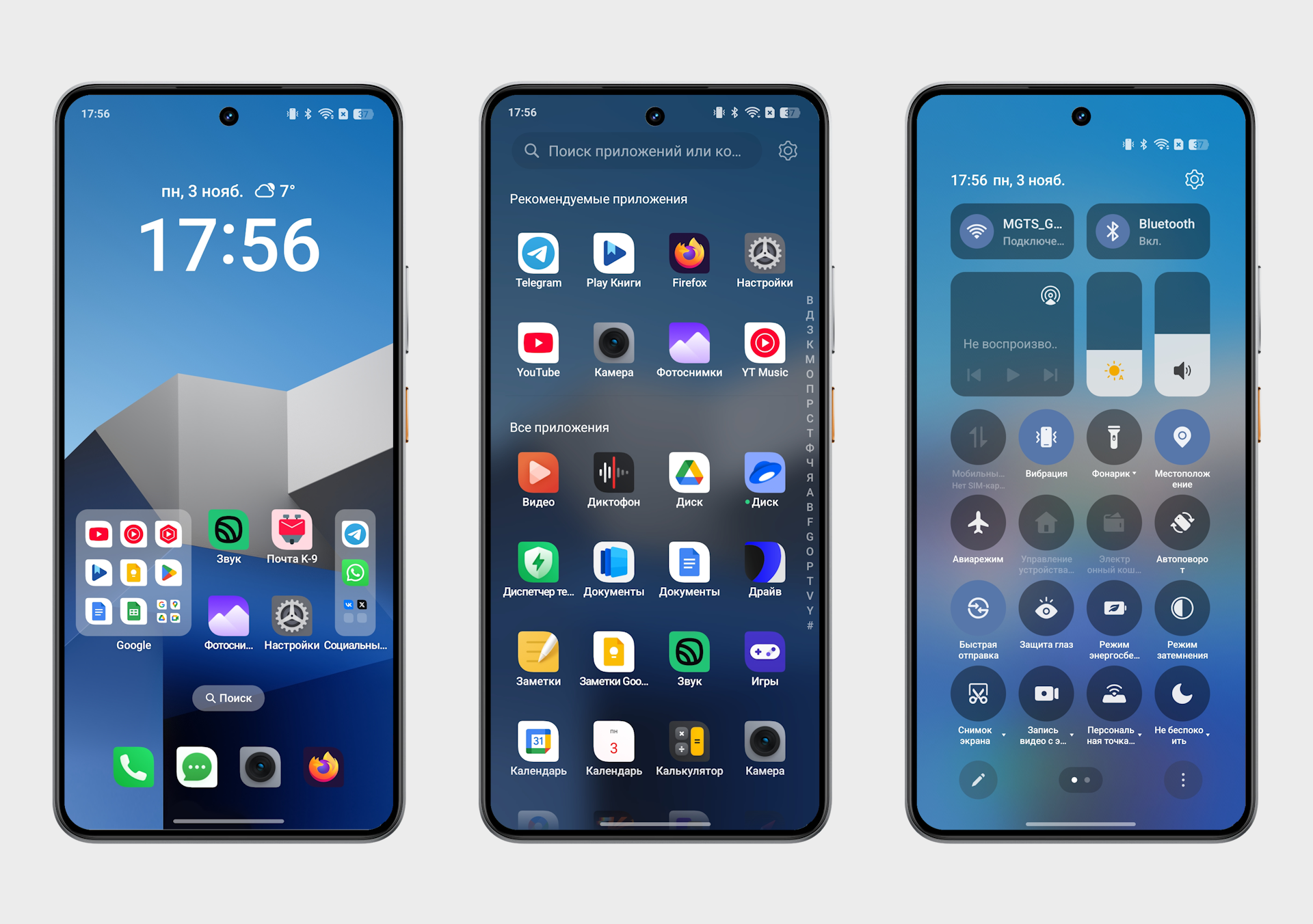 Оболочка приятная: много настроек по кастомизации, есть удобные мелочи, вроде «Больших папок», чтобы держать больше приложений под рукой на одном экране. Шторку уведомлений можно разделить на панель контрольного центра и уведомления, как в iOS, либо оставить стандартный для Android вариант, когда информация размещается на одном экране. Также можно выбирать и схему рабочего стола — стандартный для Android вариант с отдельным меню установленных программ либо схема взятая из iOS, когда все установленные программы расположены на рабочих столах.