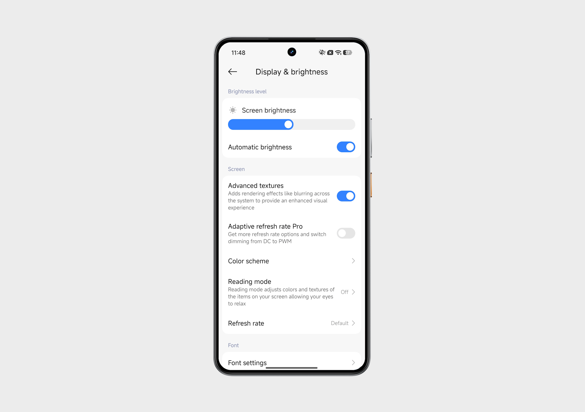 Субъективно к экрану никаких претензий. Яркий, чёткий, цвета насыщенные, но без перегибов. И все можно настроить под себя. Есть поддержка Always On, причём в двух вариантах. Один — классический, когда экран по большей части выключен, но на нём отображается время, уведомления и другая полезная информация. Второй — когда он остаётся, фактически, включён, но на минимальной яркости и частоте. Такой подход первыми стали предложили Apple, а позднее многие Android-производители его переняли.