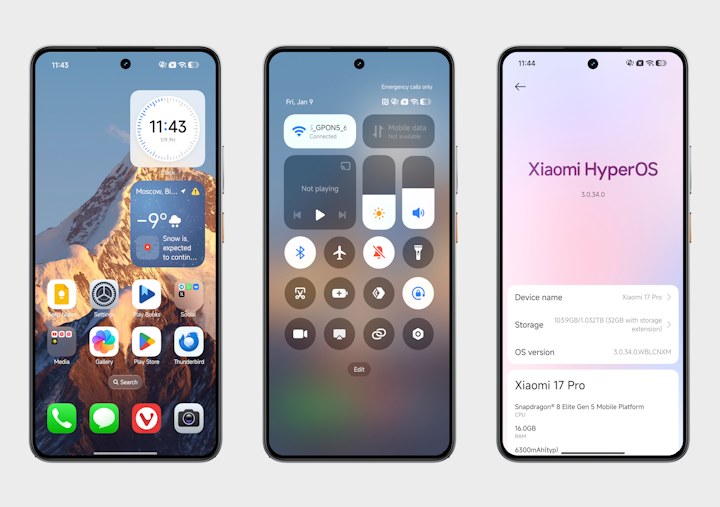 На момент публикации Xiaomi 17 Pro работает под управлением Android 16 с оболочкой HyperOS 3. В оболочке Xiaomi тоже постарались, чтобы любители Apple чувствовали себя как дома. Здесь похожий дизайн, включая форму иконок и виджетов, раздельные экраны уведомлений и контрольного центра,  заставки экрана блокировки с кастомизацией и куча всяких мелочей.