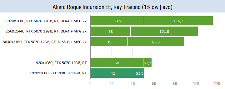 В Full HD при трассировке внезапно уменьшается разрыв между GeForce RTX 5070 и GeForce RTX 2080 Ti. Но старая видеокарта не поддерживает генерацию кадров, что станет серьезным преимуществом GeForce RTX 5070. Сочетание самого простого режима Multi Frame Generation с DLSS Quality позволяет комфортно играть в 4K на RTX 5070. Минимальные показатели с генерацией традиционно невысокие, но в реальности игра ощущается весьма плавно и неплохо. Ниже демонстрация того, как идет игра в 4K с максимальной графикой и трассировкой на GeForce RTX 5070.