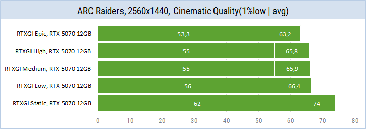 Вначале оценим влияние RTXGI на общую производительность. Тесты на GeForce RTX 5070 с максимальным кинематографическим качеством.