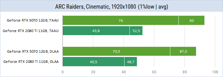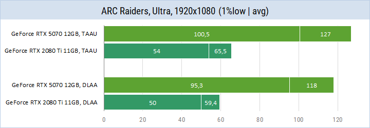 Далее результаты видеокарт GeForce RTX 5070 и GeForce RTX 2080 Ti в форматах 1080p и 1440p при сглаживании TAAU, DLAA и в разных режимах DLSS.