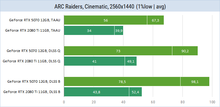 GeForce RTX 5070 легко справляется с форматом 2560x1440, а GeForce RTX 2080 Ti выдает более 60 кадров только при DLSS Balanced. Разница между соперниками около 80%.
