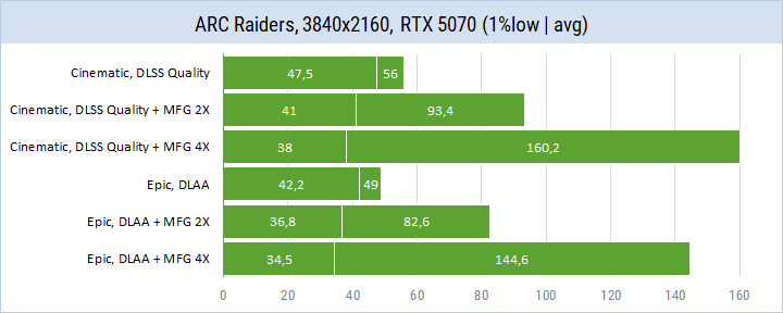 Если дополнительно задействовать технологию генерации кадров NVIDIA MFG, то можно играть при настройках Cinematic иди даже с самым качественным сглаживанием DLAA.