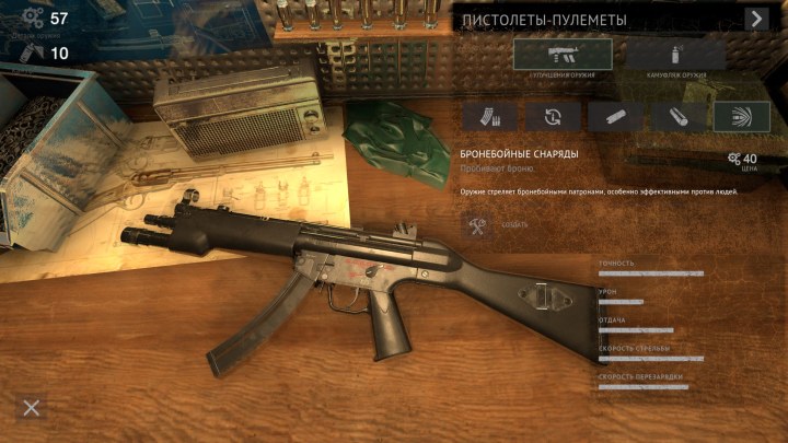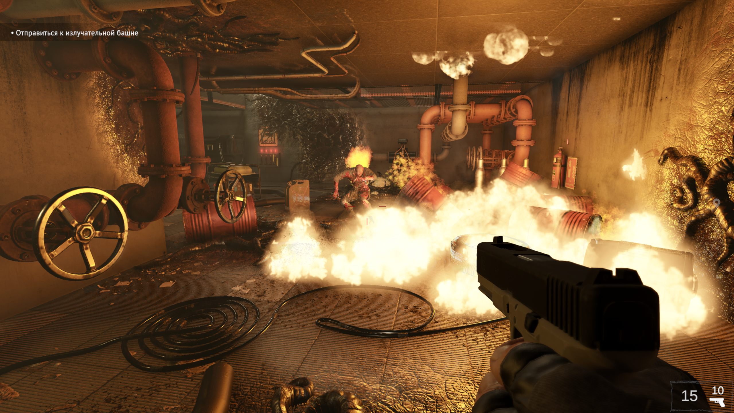Арсенал небольшой — пистолет, пистолет-пулемет, дробовик, двустволка и дробовик. Зато есть система апгрейдов. Собирая металлический хлам на локациях, потом можно его потратить на улучшения для стволов, используя специальный верстак.