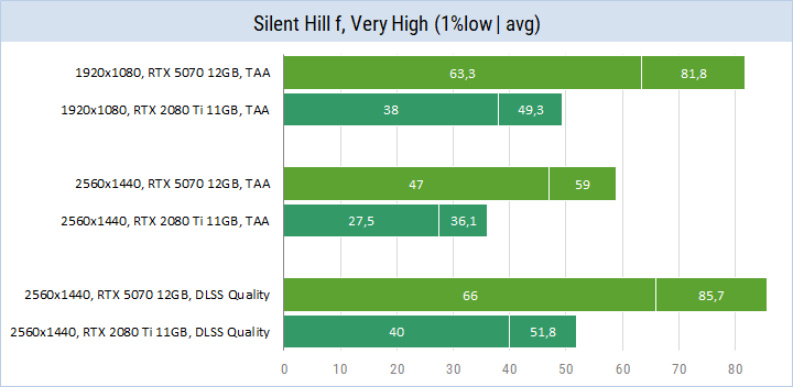 С учетом небольших игровых локаций производительность в игре не самая лучшая даже по меркам Unreal Engine 5. Но надо учитывать, что выбранная сцена одна из самых тяжелых в игре. Видеокарта GeForce RTX 5070 достойно справится с нативным форматом 1440p, а старая GeForce RTX 2080 Ti хорошо справится с Full HD. Разница между ними примерно 65%. Можно сказать, что результаты вполне ожидаемы для такого движка.