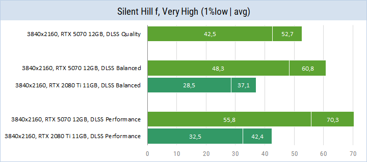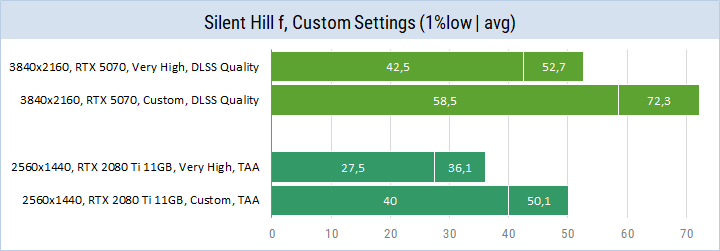 Приведенная конфигурация настроек позволяет повысить частоту кадров на 37% для GeForce RTX 5070 и на 39% для более старой GeForce RTX 2080 Ti. Хорошее ускорение при минимальных упрощениях в графике.