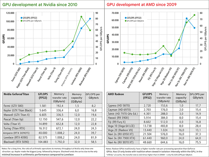 По этому графику можно легко отследить эволюцию графических чипов. Если сравнивать флагманы, то современный GeForce RTX 5090 (Blackwell) почти в 23 раза быстрее GeForce GTX 480 (Fermi)! Если брать более близкие поколения, то GeForce RTX 5090 примерно в 2,8 раз быстрее GeForce GTX 1080 Ti.