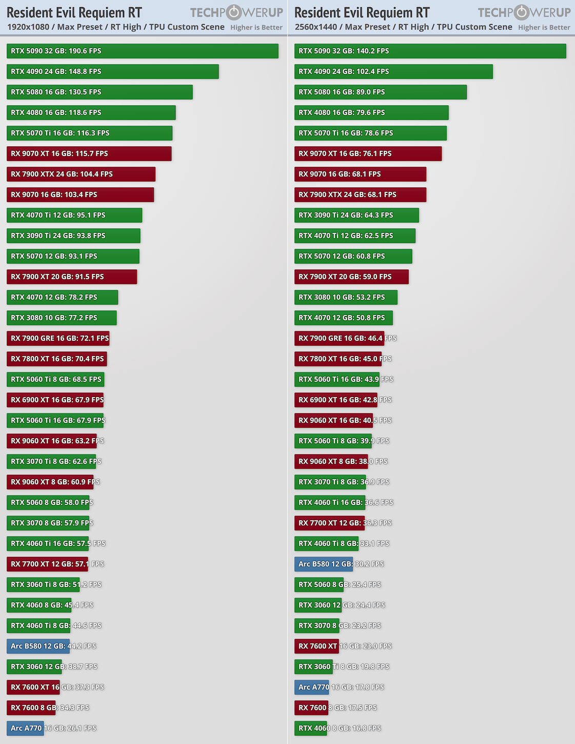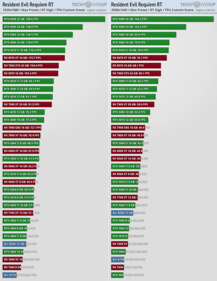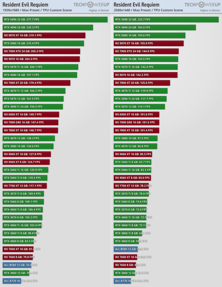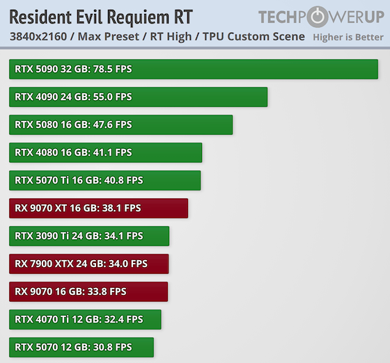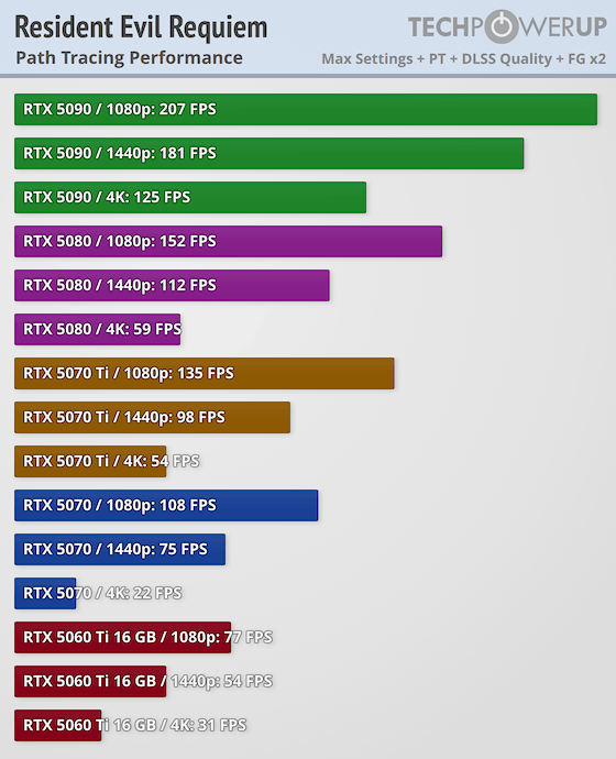 На некоторых ресурсах появились первые обзоры производительности. Сайт TechPowerUp представил самое масштабное тестирование при участии 34 видеокарт от NVIDIA, AMD и Intel. Движок игры в очередной раз улучшили и прокачали, теперь он поддерживает не только трассировку лучей, но и более продвинутую трассировку пути. Также есть DLSS Ray Reconstruction для более точной детализированной картинки. Что касается масштабирования, то игра поддерживает NVIDIA DLSS 4 с генерацией Resident Evil Requiem. Активация трассировки пути автоматически предусматривает включение DLSS.