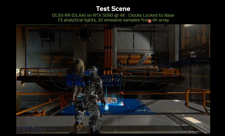 Отдельная часть выступление посвящена оптимизации производительности. Была показана сцена Pragmata, которая работала в 4K с Ray Reconstruction и DLAA на GeForce RTX 5090. В этой сцене 73 виртуальных источника света (analytical lights) и 32 источника излучения (emissive samples).