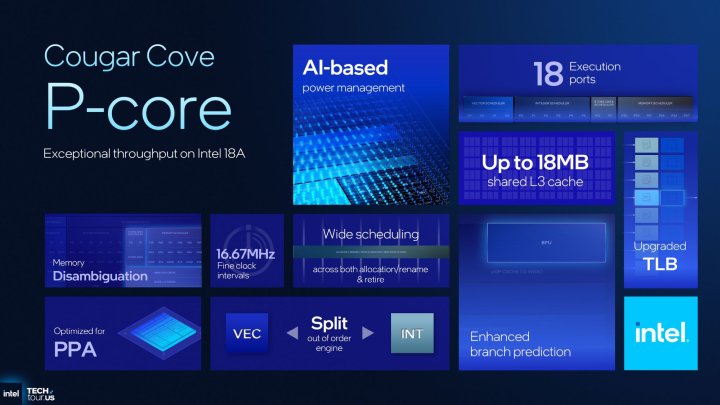 Panther Lake используют ядра разной архитектуры — высокопроизводительные P‑ядра Cougar Cove, энергоэффективные E-ядра Darkmont и дополнительные маломощные LPE-ядра Darkmont для фоновых процессов и низкой нагрузки. Архитектура Cougar Cove является улучшенной версией Lion Cove с повышенной энергоэффективностью, улучшенным планировщиком, предиктором ветвлений, улучшенной работа буфера и другими улучшениями. Каждое ядро имеет кэша L1 256 КБ н и L2 3 МБ. Производитель обещает рост однопоточной производительности 10% относительно процессоров Lunar Lake и Arrow Lake при том же энергопотреблении.