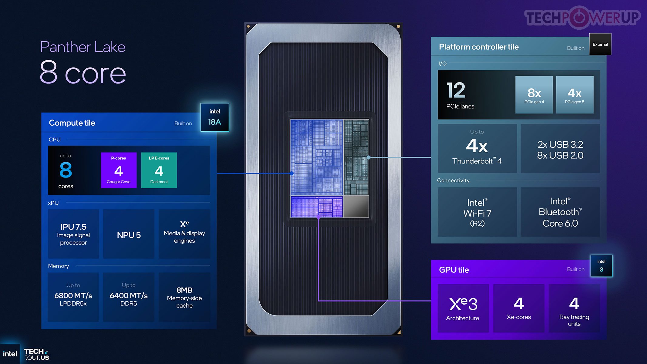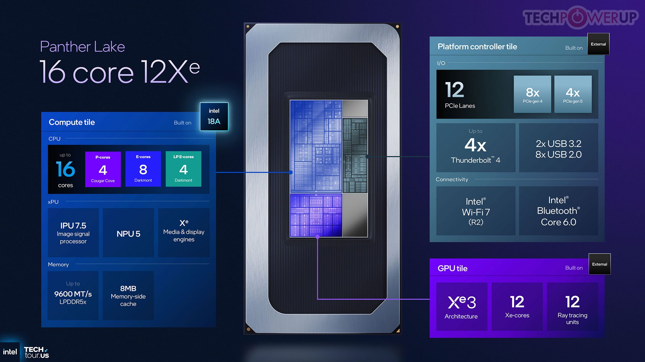 Процессоры получат до 16 процессорных ядер, новую графику Xe3, нейронный блок NPU 5-го поколения, быстрый внутренний интерфейс IPU 7.5, поддержку памяти LPDDR5 9600 МТ/ до 96 ГБ, до 12 линий PCIe 5.0, поддержку Wi-Fi 7, Intel Bluetooth Core 6, Thunbderbolt 5/4. Новые процессоры имеют чиплетную структуру. Основной блок Compute Tile с процессорными ядрами будет изготавливаться на техпроцессе Intel 18A, графический блок выполнен на техпроцессе Intel 3 или TSMC N3E, блок с контроллерами на TSMC N6.