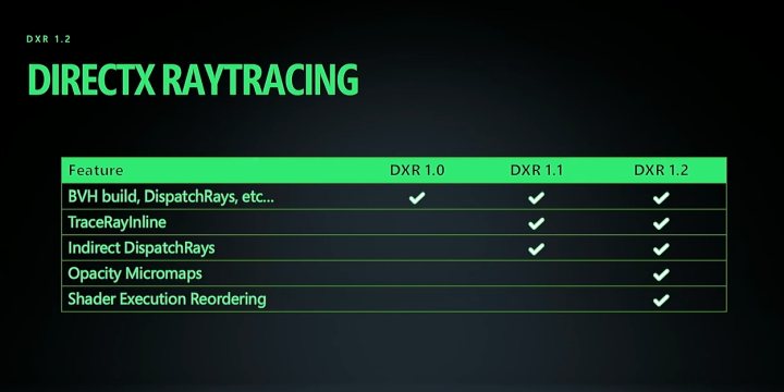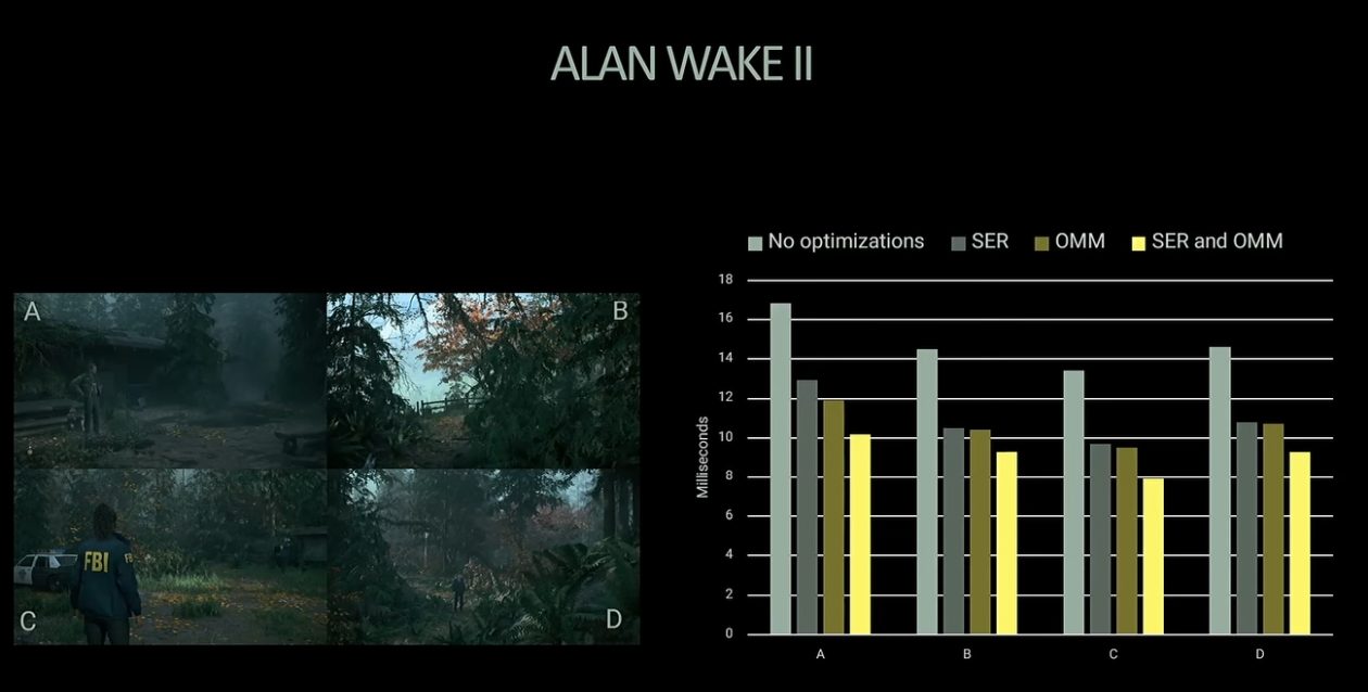 При определенных условиях SER способен улучшить производительность в расчете структур для трассировки в два раза. Также в DXR 1.2 добавлена поддержка функций Opacity Micromaps (OMM). Ранее разработчики из Remedy рассказывали, что SER и OMM могут ускорить производительность трассировки в Alan Wake 2 до 60% при разрешении 2560x1440. А ускорение на видеокартах Intel еще выше.