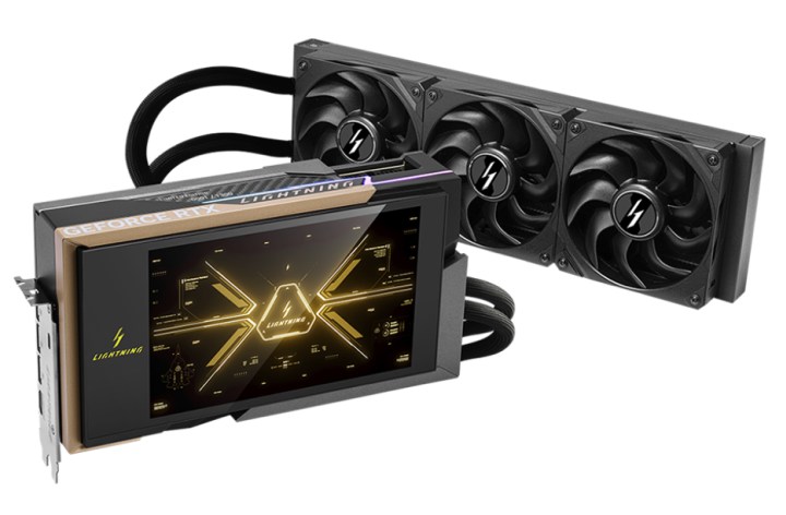 Но даже в заводском варианте эта видеокарта готова предложить лучшее сочетание потенциала и характеристик. Она охлаждается большим водоблоком полного покрытия с медным основанием, эффективной помпой и радиатором на три вентилятора 120 мм. Задняя сторона закрыта карбоновым бэкплейтом. Все это дополняет большой 8-дюймовый экран, на который можно выводить данные мониторинга или другую информацию.