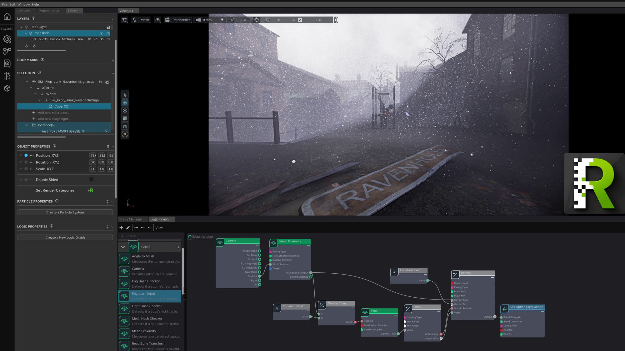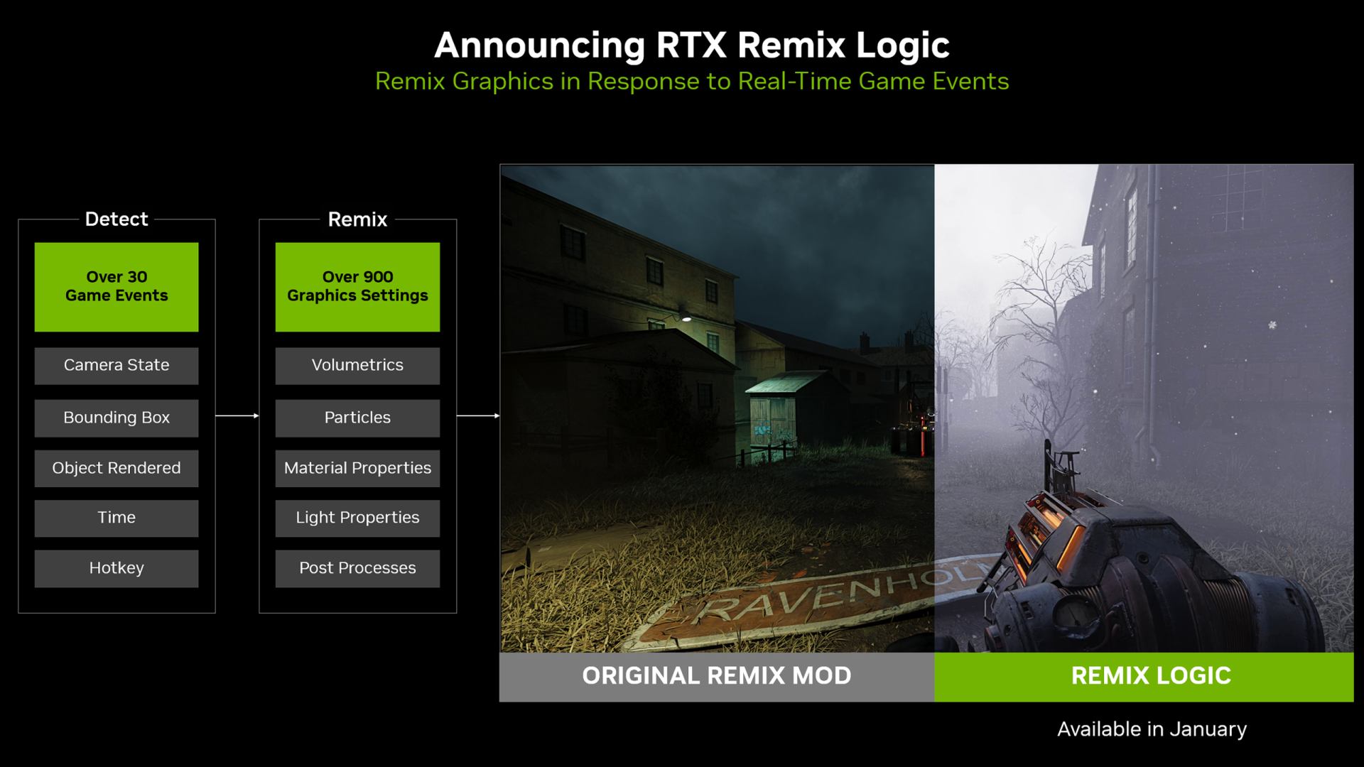 RTX Remix Logic позволяет добавлять готовые погодные условия и разные другие эффекты, которые привязаны к определенным событиям и условиям. Например, какие-то эффекты будут работать только в случае нахождения героя на открытом воздухе. Новая система поддерживает более 30 событий, упрощая интеграцию новых эффектов.