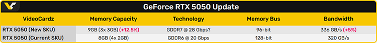 Это означает, что GeForce RTX 5050 9GB будет использовать три модуля GDDR7 по 3 ГБ, которые уже существуют и используются в некоторых продуктах (например, в мобильной GeForce RTX 5090 24GB). Переход на быструю память компенсирует узкую шину и даже обеспечит небольшой рост общей пропускной способности с 320 ГБ/с до 336 ГБ/с. То есть пользователи получат более быстрое решение с дополнительным гигабайтом.