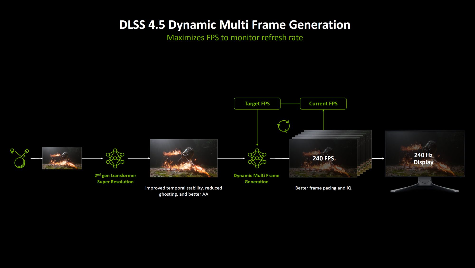 Новый режим Dynamic MFG 6X вместе с масштабированием позволяет играть при стабильных 240 кадрах на 4K-мониторах 240 Гц даже с максимальной графикой и трассировкой.