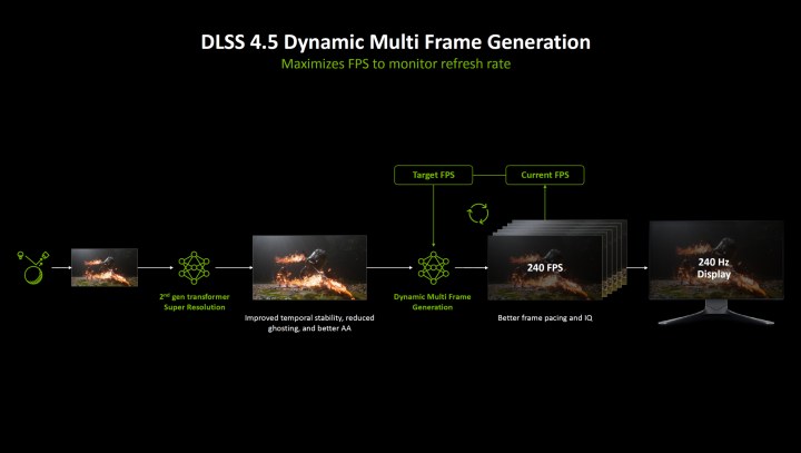 Также представлена динамическая версия генерации кадров Dynamic Multi Frame Generation 6X. Тут вместо фиксированного множителя движок генерации подстраивается под нагрузку и меняет количество создаваемых кадров. При максимальной нагрузке на GPU падением производительности будет генерироваться до 5 кадров (режим MFG 6X). Задача такого режима — обеспечить более стабильную целевую частоту кадров для лучшего воспроизведения и синхронизации с мониторами.
