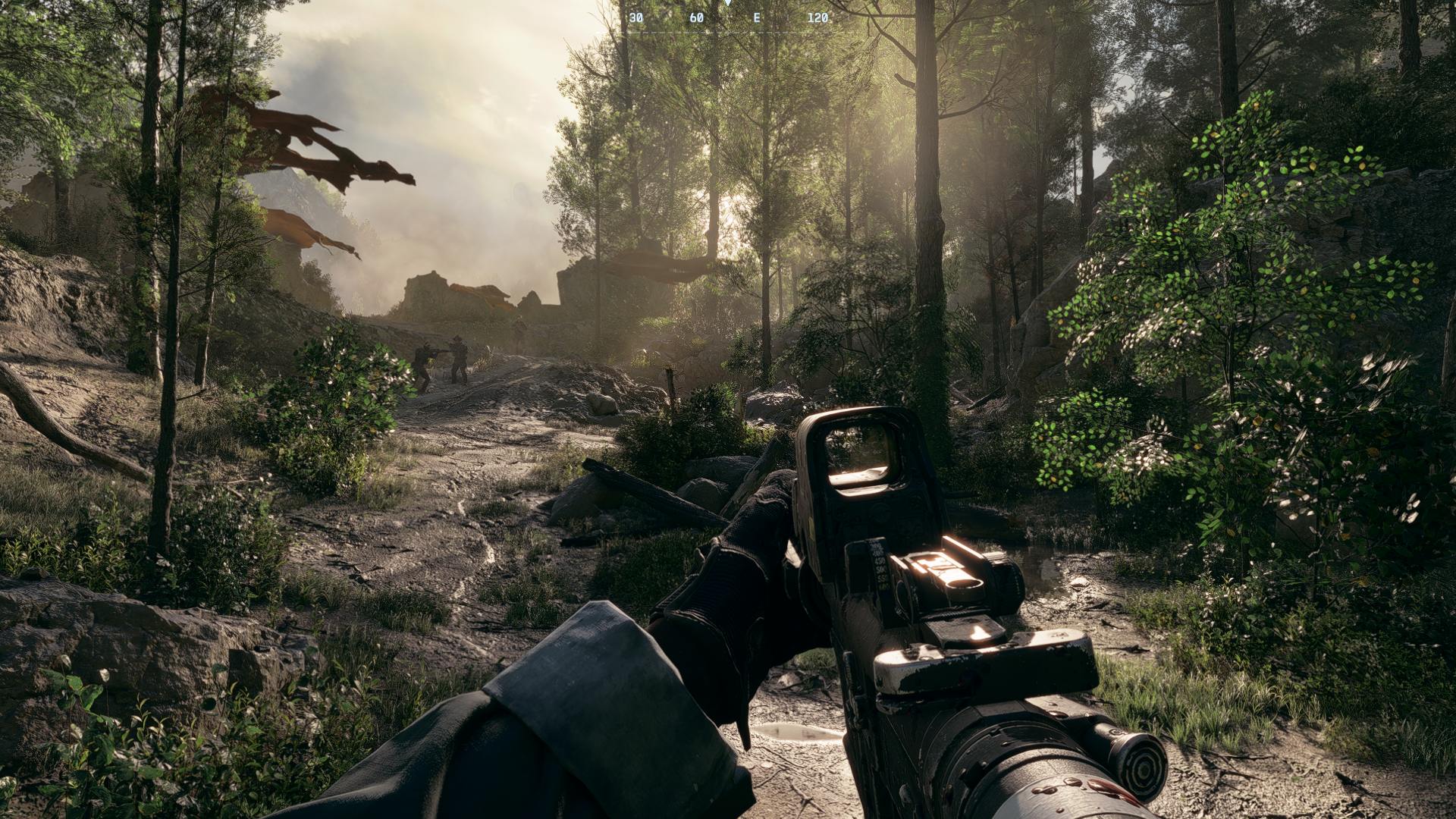 Тестовая прогулка в первой миссии Always Faithfull, когда герои после поездки на машине выходят в роще и занимают позицию для вызова авиаудара. Тут сложный ландшафт, высокая детализация растительности и одновременно идет спуск к большой открытой локации.