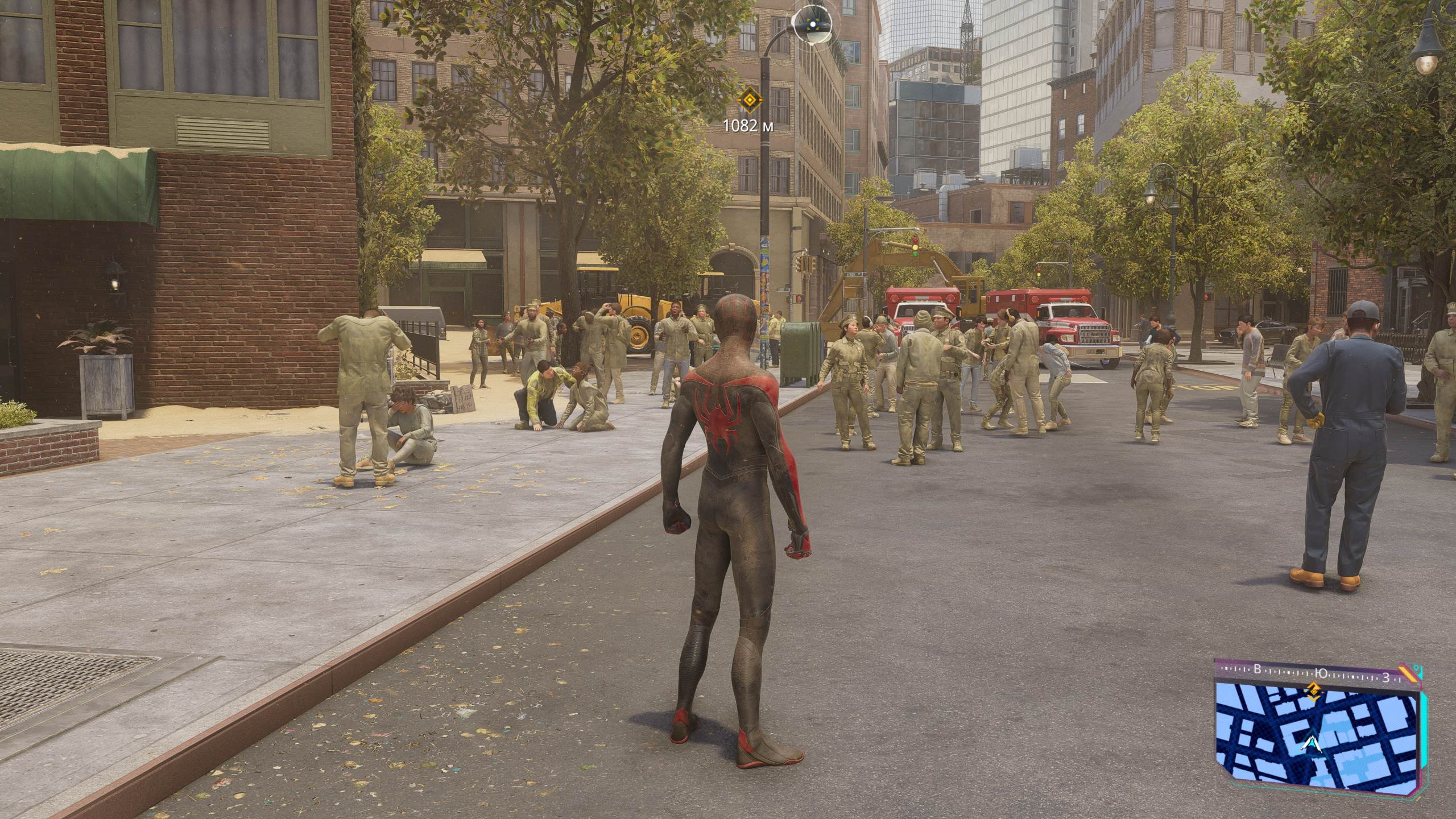 Тестовая прогулка по городу после победы над Песочным человеком. Пробежка по улице с множеством людей и пожарных, а потом пролет между домами