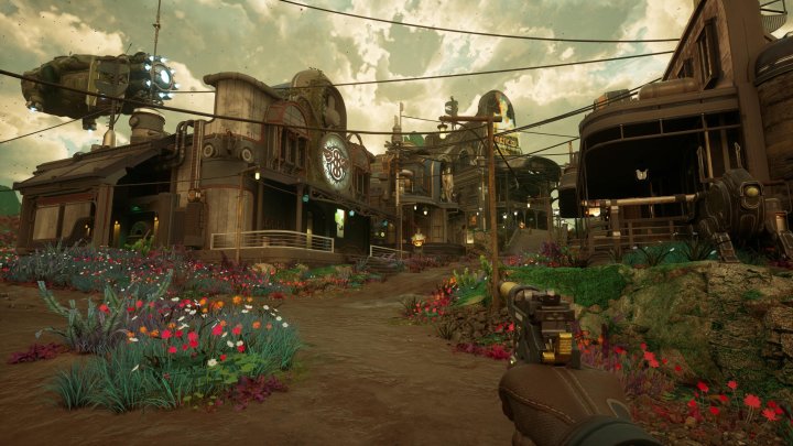 Тестовая прогулка в прологе во время спуска от дома героини к городку по тропинке в окружении детализированных домиков и растительности.