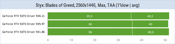 Игра вышла в конце февраля, и тут я ожидал какого-то явного изменения результатов. Но все в пределах погрешности. Или условия тестовой сцены таковы, что на GeForce RTX 5070 никаких явных позитивных изменений нет.